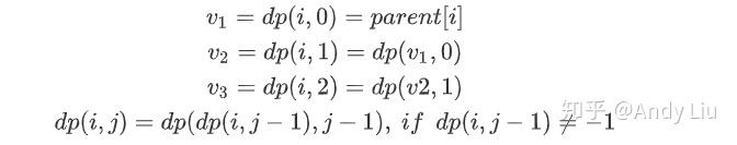 我们主要优化的就是查找的过程,使查找的复杂度从O(n)降低到O(logn)。我们使用动态规划,dp(i,j)表示结点i向上找